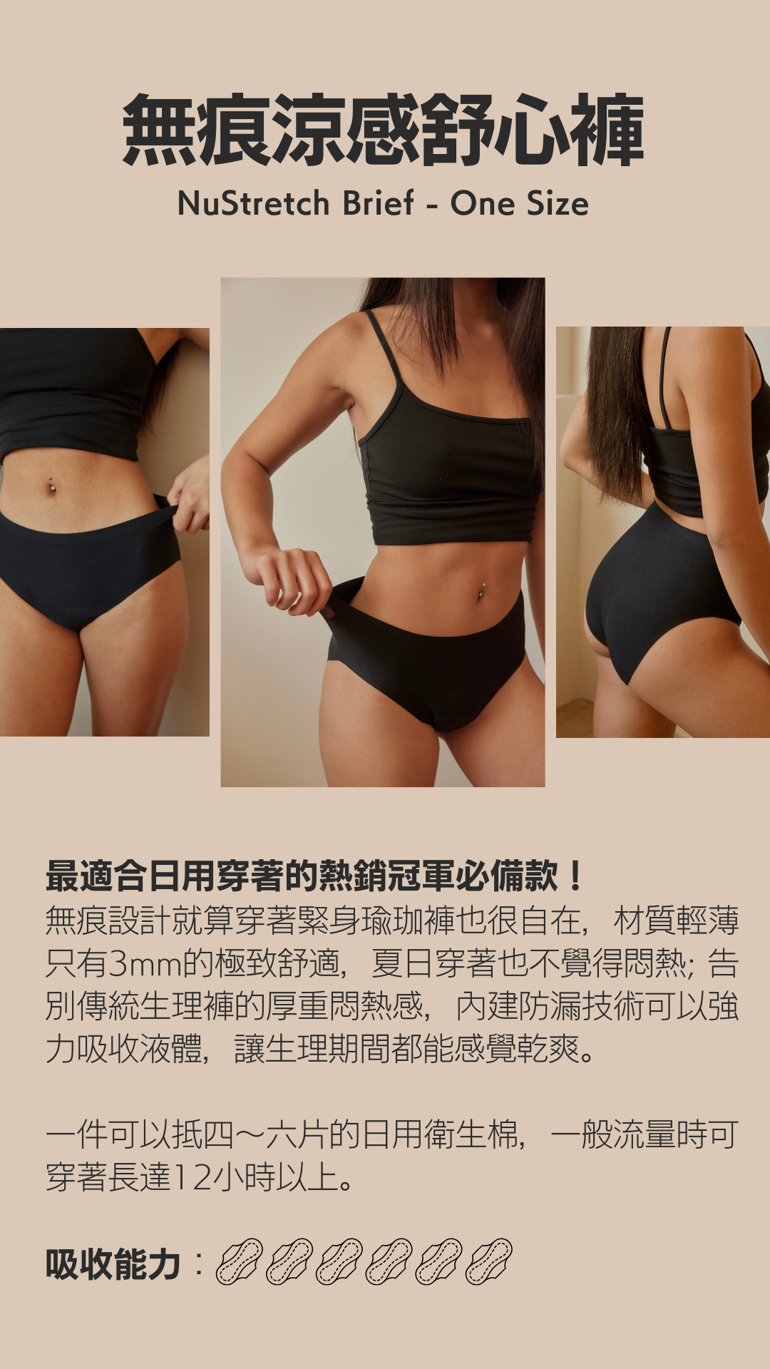 日常必備款!無痕設計超適合穿緊身褲、瑜珈褲。獨家 NuStretch® 面料輕薄服貼,只有3mm,涼感不悶熱。一件可抵4~6片日用衛生棉,吸收各種分泌物,讓妳隨時保持乾爽舒適。